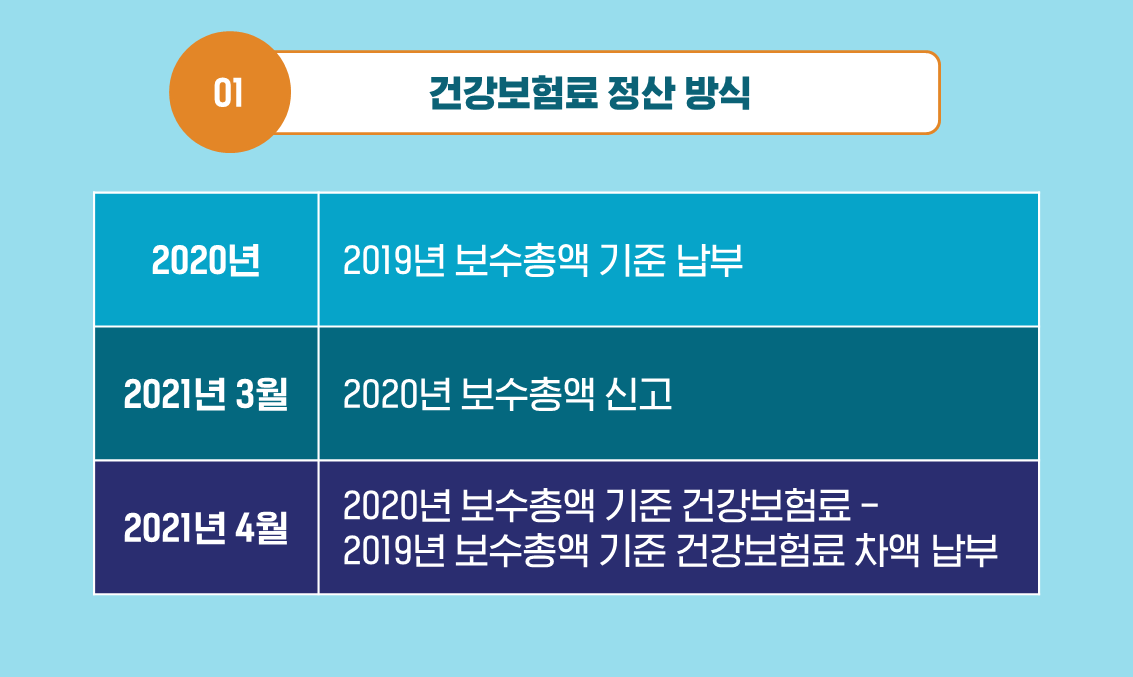 정리하자면 다음과 같습니다. 2020년 한 해 동안 직장인들은 2019년 보수총액을 기준으로 부과된 건강보험료를 매달 납부했습니다. 그리고 2021년 3월에 2020년의 보수총액을 신고한 후, 2020년도와 2019년도 보수총액 기준 건강보험료의 차액을 납부하게 되는 것이죠.