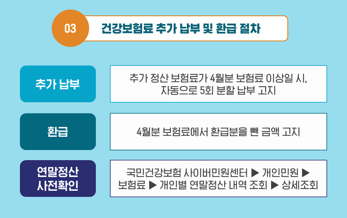 자칫하면 목돈이 빠져나갈 수도 있기에, 개인 상황에 따라 걱정이 먼저 앞설 수도 있는데요. 이런 분들의 현명한 지출 관리를 위해 건강보험료 연말정산 금액을 미리 확인할 수 있는 서비스가 마련되어 있습니다. 국민건강보험 사이버민원센터 홈페이지(https://www.nhis.or.kr/nhis/index.do)에서 개인별 정산 내역 조회가 가능하니 참고해주세요!
