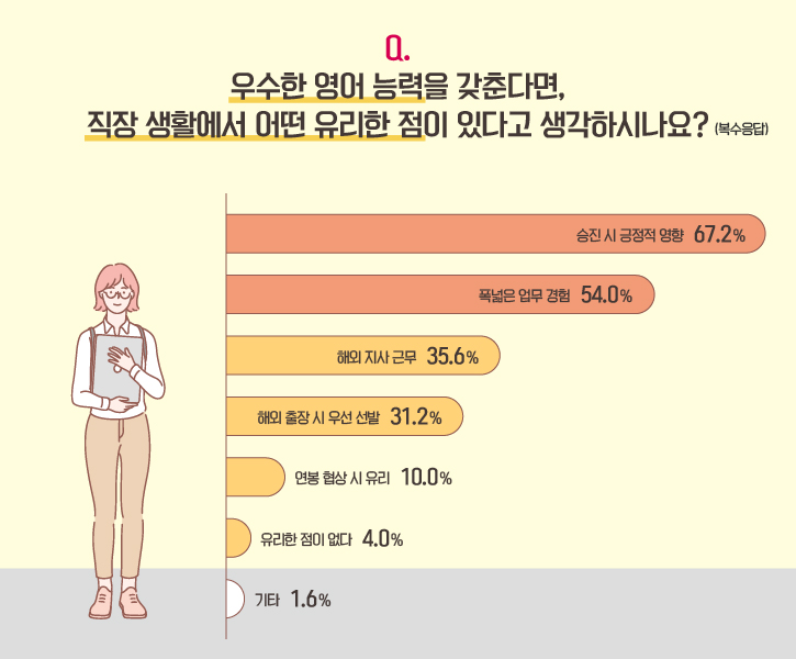 이어서, 훌륭한 영어 실력이 가져다주는 구체적인 이점에 대해 물어봤습니다. ‘승진에 긍정적인 영향’을 준다는 답변이 67.2%로 가장 많았고, ‘폭넓은 업무 경험’을 꼽은 비율도 절반 이상(54%)을 차지했습니다. ‘해외 지사 근무(35.6%)’와 ‘해외 출장 시 우선 선발(31.2%)’ 역시 많은 선택을 받으며, 외국어를 직접적으로 활용해야 하는 상황에서 우수한 영어 능력이 갖는 경쟁력을 보였습니다.