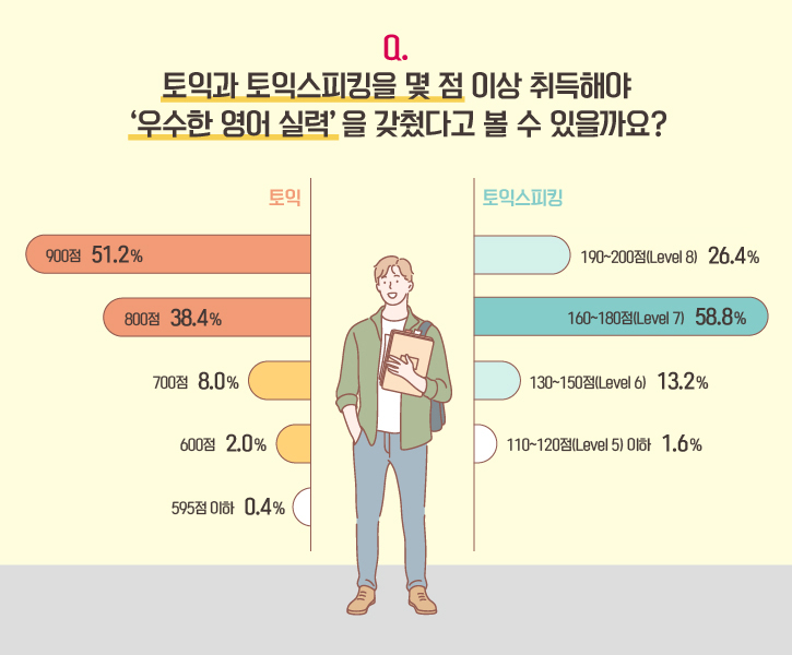 '우수한 영어 실력'의 기준은 무엇일까요? 설문 응답자의 절반 이상이 '토익 900점, 토익스피킹 레벨7 이상'을 우수한 영어 실력의 기준으로 꼽았습니다. 이어 응답자의 38.4%, 26.4%는 각각 '토익 800점 이상, 토익스피킹 레벨8 이상'이라고 답했는데요. 토익스피킹 1위(레벨 7)와 2위(레벨 8)의 차이가 32.4%로 12.8%인 토익에 비해 크게 나타났습니다.