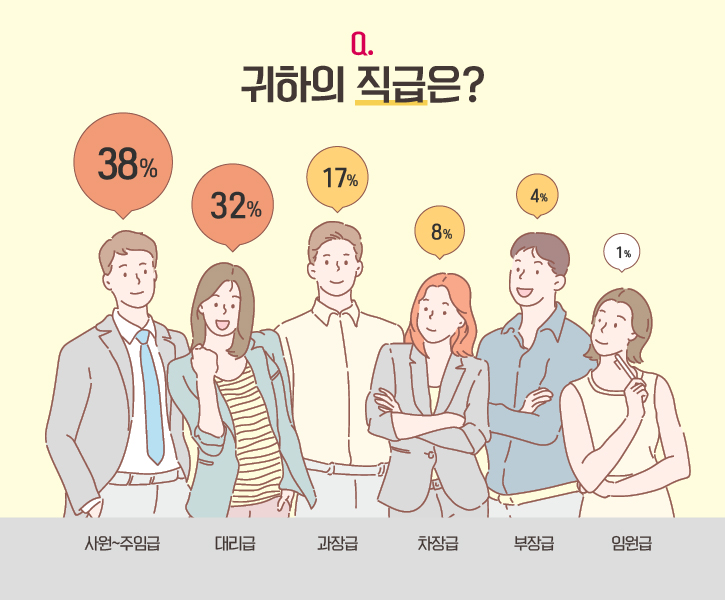 이번 설문조사엔 다양한 직급의 직장인 여러분이 의견을 보내주셨는데요. 특히, '사원~주임급(38%)'과 '대리급(32%)'분들이 다수 참여해주셨습니다. '과장급', '차장급'분들도 응답자의 17%, 8%를 차지하며 현실적인 생각을 전달해주셨습니다.