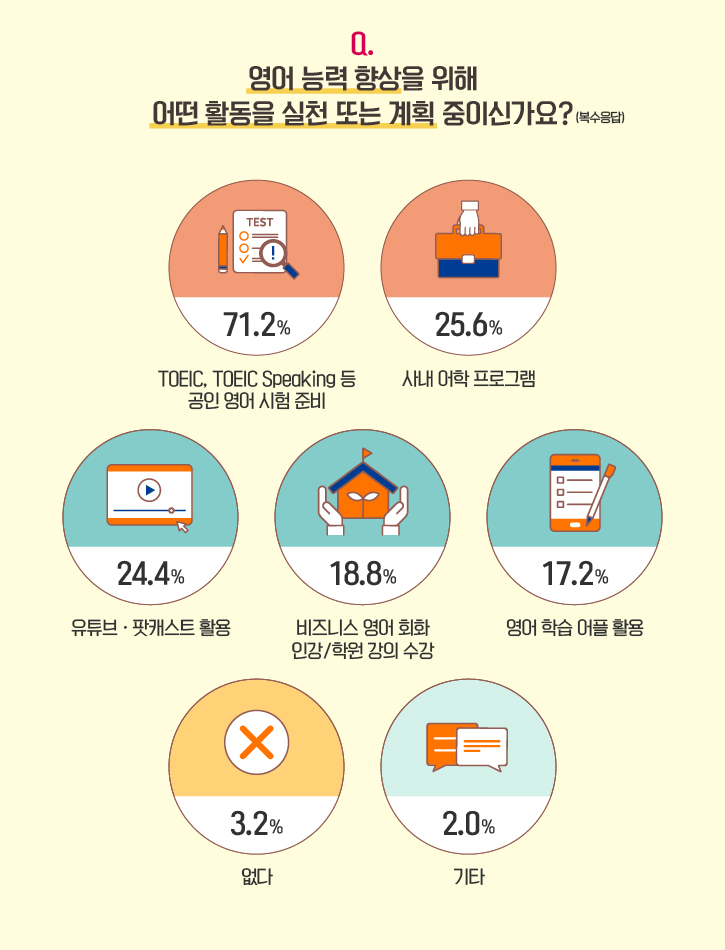 마지막으로, 유창한 영어 활용을 위해 실천 또는 계획 중인 활동을 물었습니다. 전체 참여자의 3분의 2를 뛰어넘는 71.2%가 ‘TOEIC, TOEIC Speaking 등 공인 영어 시험’을 준비하고 있거나, 할 예정이라고 밝혔는데요. ‘사내 어학 프로그램(25.6%)’과 ‘유튜브·팟캐스트(24.4%)’를 활용하는 방안이 뒤따랐고, ‘비즈니스 영어회화 인강 및 학원 강의(18.8%)’, ‘영어 학습 애플리케이션(17.2%)’으로 영어 실력 역량 향상을 꾀하는 분들도 있었습니다. ‘영미 언론사 뉴스레터 구독’, ‘원서 독서’ 등 기타 의견도 눈에 띄네요 :)