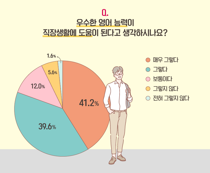 영어 능력과 직장생활의 관계에 대해 설문 참여자의 약 81%가 ‘영어 실력이 좋으면 회사생활에 도움된다’고 답했습니다. ‘보통이다’는 의견도 12%를 기록했으며, ‘도움이 되지 않는다’고 생각하는 분들은 약 7%에 그쳤습니다.