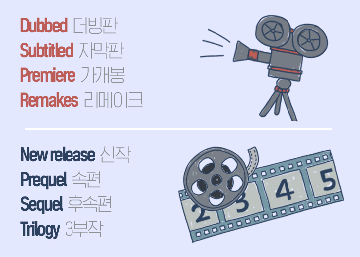 항상 설레는 신작 영화는 ‘New release’인데요. 영화뿐만 아니라 음반, 도서, 게임 등 다양한 산업에서 이용되는 용어랍니다. 한편, 본편 이전의 이야기를 다루는 속편은 ‘Prequel’, 이후의 내용을 담은 후속편은 ‘Sequel’로 나타내며, 이렇게 세 가지 버전으로 이어지는 영화는 ‘Trilogy(3부작)’라고 표현합니다.