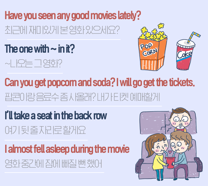 영화관에 도착해서 제일 먼저 할 일은 먹거리 담당과 발권 담당을 나누는 일인데요. ‘Can you get popcorn and soda? I will go get the tickets’는 ‘내가 티켓을 예매할테니, 팝콘과 음료수 좀 사다줄래?’라는 뜻을 지닙니다. 예매 창구에 도착해선 자리를 정해야 하죠. 이럴 땐 ‘I’ll take a seat in the back row(여기 뒷줄 자리로 할게요)’라는 문장의 유형을 숙지해두고, 상황에 따라 유연하게 변형해주시면 됩니다.