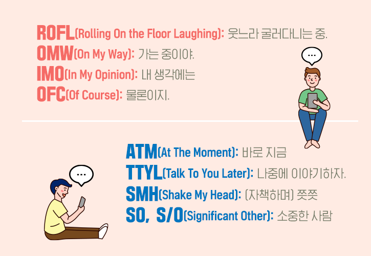 ‘ATM’을 보면 괜스레 지갑 속에 현금이 얼마나 있나 확인하게 될 텐데요. 메시지에서는 ‘At The Moment(바로 지금)’의 약자로 쓰입니다. 또 할 말이 너무 많거나, 시간적 여유가 부족해 나중에 이야기하고 싶을 땐 'TTYL(Talk To You Later)'이라고 해주세요. 간혹 바보 같은 행동을 해서 스스로가 한심하다면 ‘SMH(Shake My Head)’을 쓸 수 있습니다. 자책하며 고개를 절레절레 흔드는 모습, 모두 상상이 가시죠? 마지막으로, 연인, 가족, 가까운 지인 등 소중한 사람을 나타내는 약어는 ‘SO(S/O)’이며, ‘Significant Other’의 준말입니다!