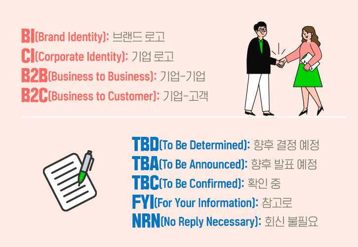 개인의 신원을 확인하는 신분증에 증명사진이 빠지지 않는 것처럼, 대다수의 브랜드 및 기업은 'BI(Brand Identity)'와 'CI(Corporate Identity)'라고 불리는 각자의 로고를 가지고 있습니다. 공적으로 취급되는 문서에 빠지지 않고 삽입되는 경우가 많으니 알아두시길 바랍니다. 또, 거래 대상에 따라 사업을 수식하는 명칭이 달라지는데요. 기업을 대상으로 할 시엔 ‘B2B(Business to Business)’, 일반 소비자를 상대로 할 땐 ‘B2C(Business to Customer)’로 표현합니다. To의 동음이의어인 2(Two)를 활용한 점이 인상 깊네요.