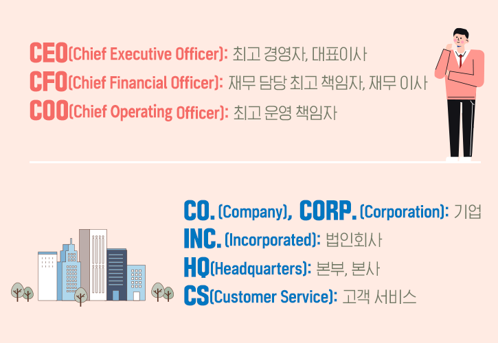 그럼 ‘기업’은 약어로 표현할 수 없을까요? 물론 가능합니다. 'CO.(Company)', 'CORP.(Corporation)'로 쓰이며, 기업명 뒤에 'INC.(Incorporated)'를 붙이면 ‘법인회사’라는 뜻을 지닙니다. 세 단어 모두 약자 뒤에 온점(.)을 찍어줘야 한다는 사실, 유의해 주세요. 기타 약어로 회사의 중심이라고 볼 수 있는 ‘본사’인 ‘HQ(Headquarters)’, 소비자의 고충을 해결해 주는 '고객 서비스'인 'CS(Customer Service)' 등이 있습니다.