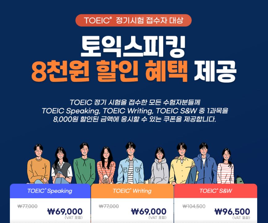 TOEIC 정기시험 접수자 전원에게 TOEIC Speaking, TOEIC Writing, TOEIC S&W 8,000원 할인 쿠폰이 지급됩니다. (5월 23일 정기시험 접수자부터 적용) 할인 쿠폰을 적용하면 TOEIC Speaking Test와 TOEIC Writing Test를 각 69,000원에, TOEIC Speaking and Writing Tests를 96,500원에 응시할 수 있는데요. 할인쿠폰은 TOEIC 정기시험 다음날 홈페이지 마이테스트에서 확인할 수 있습니다. 쿠폰 유효기간과 자세한 사용 방법을 알아볼까요?