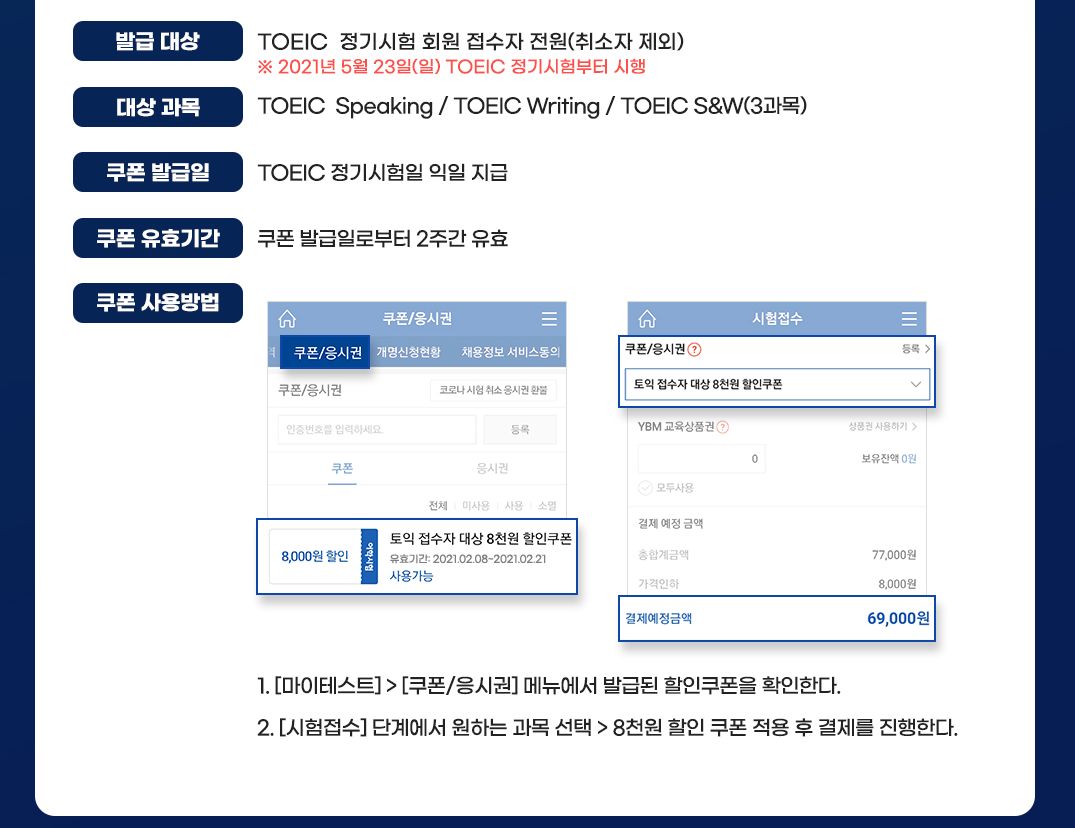 TOEIC 정기시험 접수자 전원에게 TOEIC Speaking, TOEIC Writing, TOEIC S&W 8,000원 할인 쿠폰이 지급됩니다. (5월 23일 정기시험 접수자부터 적용) 할인 쿠폰을 적용하면 TOEIC Speaking Test와 TOEIC Writing Test를 각 69,000원에, TOEIC Speaking and Writing Tests를 96,500원에 응시할 수 있는데요. 할인쿠폰은 TOEIC 정기시험 다음날 홈페이지 마이테스트에서 확인할 수 있습니다. 쿠폰 유효기간과 자세한 사용 방법을 알아볼까요?