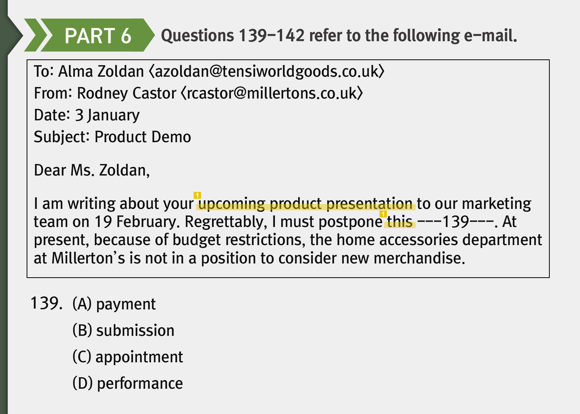 첫 문장을 살펴보면, 중심이 되는 소재 하나를 두고 이를 수식하는 구성을 갖고 있다네. 당연히, 빈칸이 지시하는 내용도 동 소재이지. 핵심이 되는 표현은 ‘upcoming product presentation(예정된 제품 소개)’로 메일 수신자는 원래 특정 제품에 대한 발표를 준비했다는 사실을 파악할 수 있다네. 따라서, 답은 (C) appointment(약속)일세.