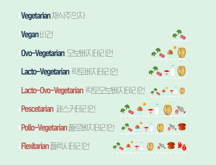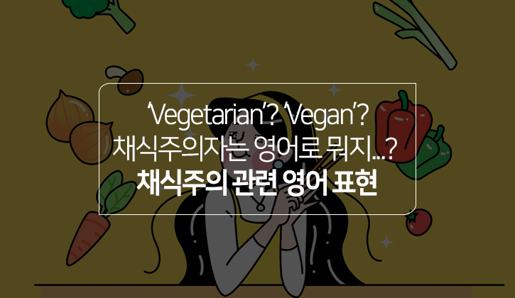 채식주의자를 명명하는 단어가 이렇게나 많습니다. 일반적인 ‘채식주의자’를 뜻하는 말은 ‘Vegetarian’인데요. 뒤에 나오는 단어 대부분이 Vegetarian의 합성어인 경우가 많기에, 잊지 말고 기억해주세요. :)