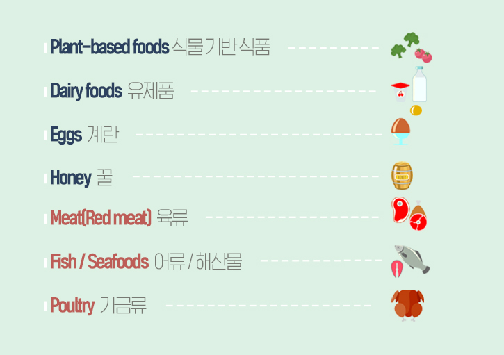채식주의에 낯설게 느껴지는 식품도 알아두어야 합니다. 육류(Meat)를 섭취하는 채식주의자도 있으며, 이때 구체적으로 적색육(Red meat)를 지칭해 구분하기도 하죠. 주로 어류나 해산물은 'Fish', 'Seafoods'로 나타내며, 닭이나 오리 등 가금류는 'Poultry'라는 단어를 활용합니다. 모두 후술할 채식주의자 구별 개념에 필요한 표현들이니 유의하시길 바래요!