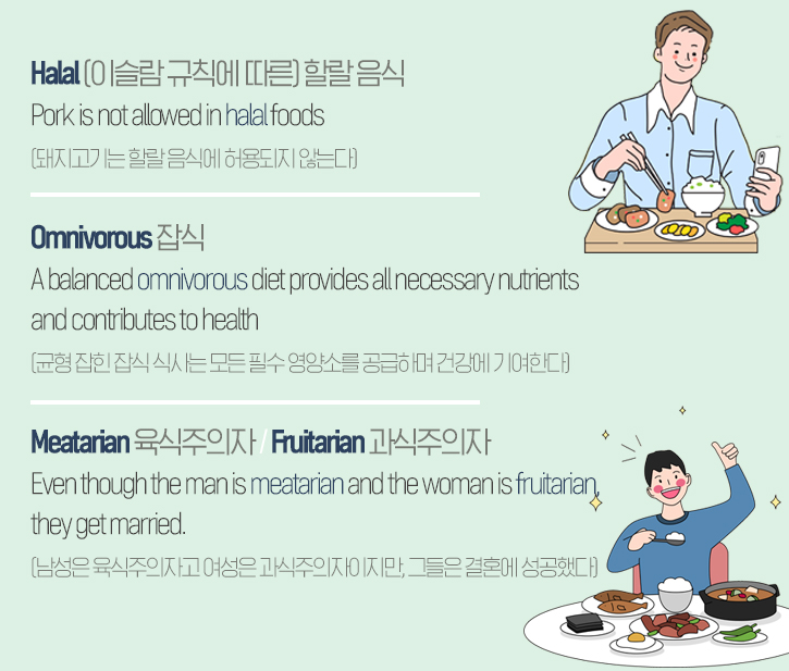 종교의 영향으로 식단을 조절하는 분들도 많습니다. 가장 유명한 예시로 이슬람을 들 수 있는데요. ‘Halal’은 이슬람 규칙에 따른 식재료 및 조리법을 사용한 음식을 의미합니다. 국내에도 할랄 푸드를 판매하는 식당이 점점 늘어나고 있으니 챙겨 두면 써먹을 날이 오겠죠?
