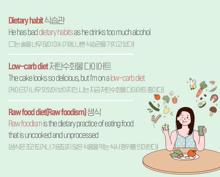 또한 녹즙 등 건강식 하면 대표적으로 손꼽히는 생식은 ‘Raw food diet’나 ‘Raw foodism’으로 표현됩니다. ‘Food’에 ‘~주의’의 의미를 더하는 ‘ism’이 결합해, Foodism이라는 단어를 만든 점이 이색적이네요.