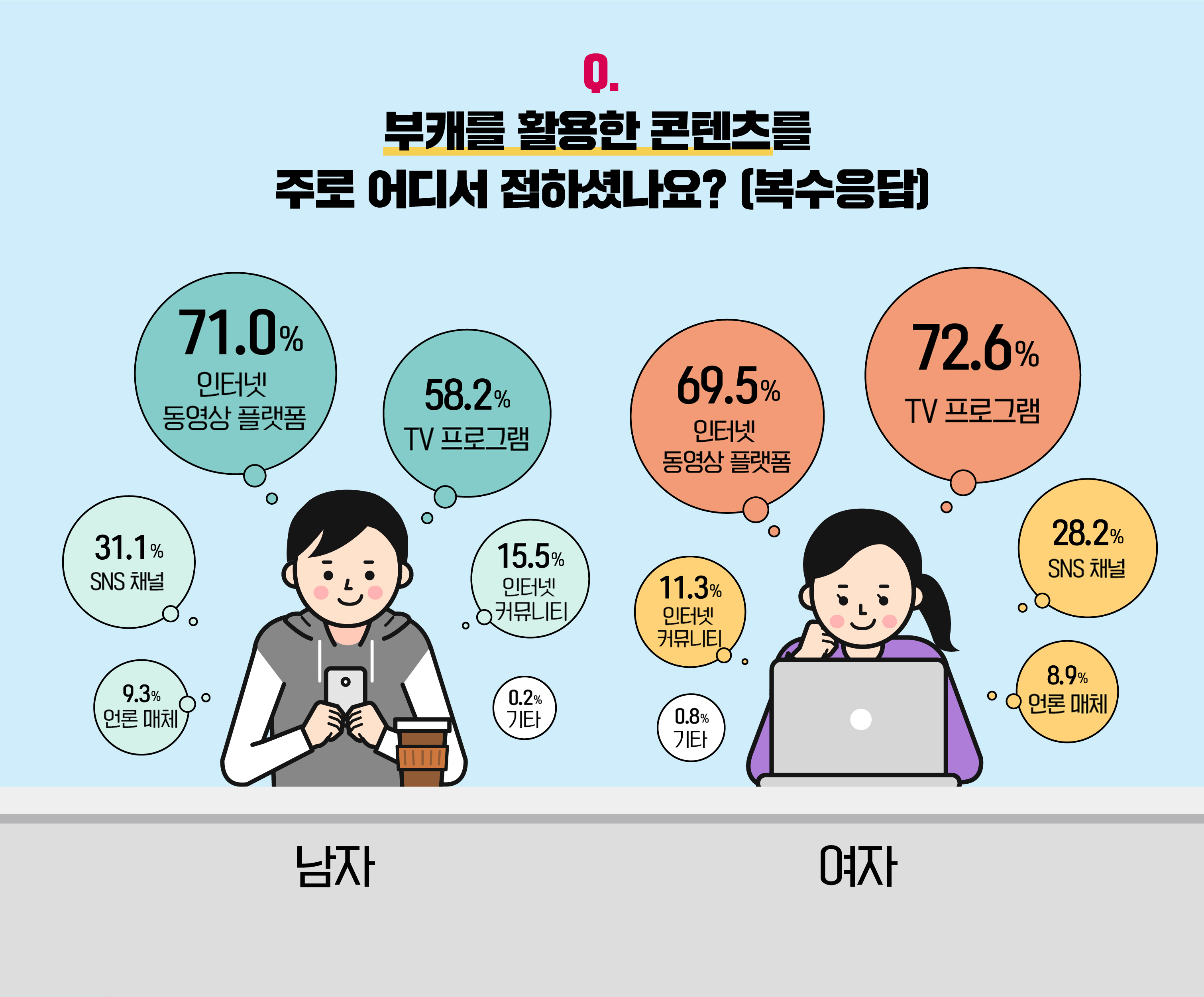 부캐 활용 콘텐츠를 주로 접한 매체에 대해선, 성별에 따라 다소 다른 결과가 도출됐습니다. 남성은 '유튜브 등 인터넷 동영상 플랫폼(71.0%)', '예능, 드라마 등 TV 프로그램(58.2%)' 순으로 답했지만, 여성의 경우 '예능, 드라마 등 TV 프로그램(72.6%)'이 '유튜브 등 인터넷 동영상 플랫폼(69.5%)'을 앞질렀습니다. 자주 노출되는 미디어가 서로 다르기 때문이라고 해석할 수 있겠죠? 그 외, '인스타그램, 페이스북 등 SNS 채널', '카페 블로그 등 인터넷 커뮤니티', '기사, 칼럼 등 언론 매체'는 비슷한 응답률을 보이며, 남녀 모두가 유사한 생각을 지닌 것으로 밝혀졌습니다.