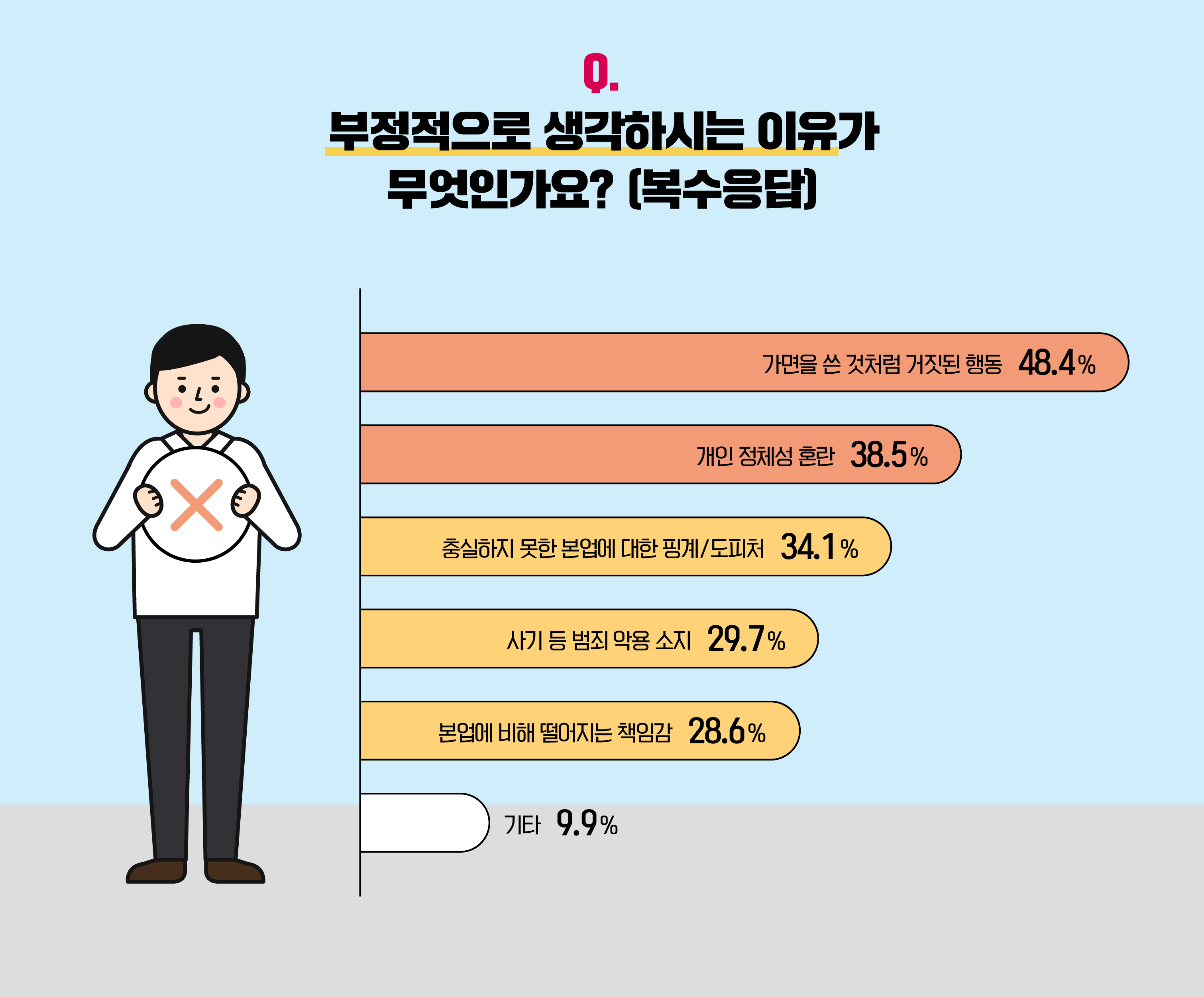 반면, 부캐의 단점을 지적하는 의견도 있었습니다. 부캐를 부정적으로 받아들이는 설문 참여자의 절반가량(48.4%)은 다른 자아로 살아가는 것이 '가면을 쓴 것처럼 거짓된 행동'으로 보인다고 답했습니다. 또, '개인 정체성 혼란(38.5%)', '사기 등 범죄 악용 소지(29.7%)'를 걱정하기도 했네요. 본업과 관련하여 우려를 나타내는 분들도 많았는데요. 부캐를 '충실하지 못한 본업에 대한 핑계/도피처'로 느끼거나, '본업에 비해 떨어지는 책임감'의 대상으로 여기는 비율이 각 34.1%, 28.6%에 달했습니다.