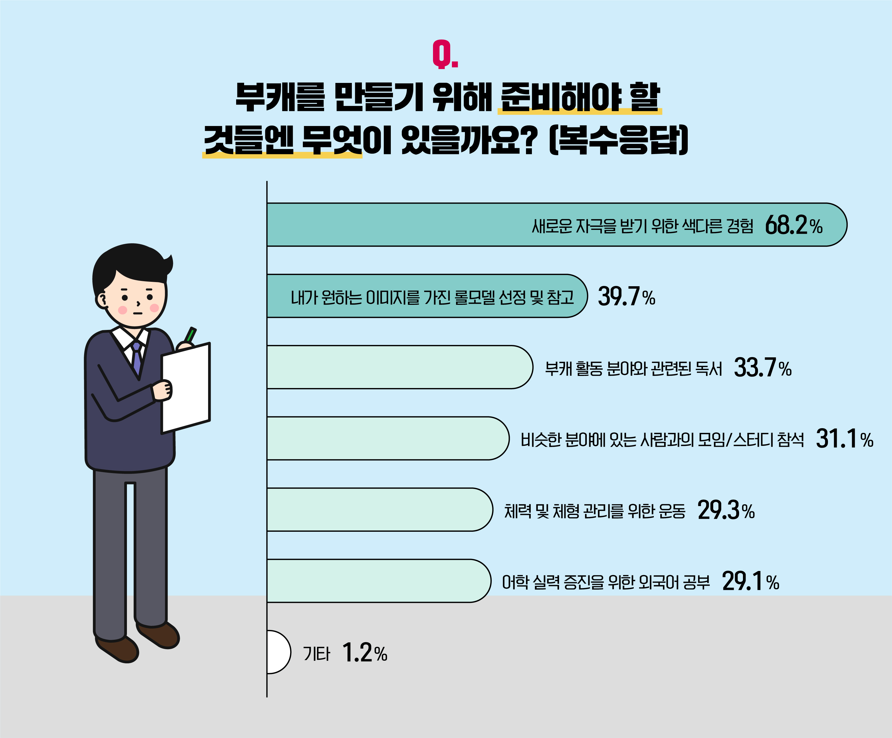 부캐의 종류가 여러 가지이고 원하는 까닭이 다른 만큼, 준비 과정에 대해서도 다양한 목소리를 들어볼 수 있었습니다. 새로운 자극을 받기 위한 '색다른 경험(68.2%)'이 제일 우선시됐으며, 개인이 원하는 이미지의 '롤모델 선정 및 참고'가 중요하다고 밝힌 비율도 전체의 약 40%에 달했는데요. 이외에도, 30% 내외의 조사 참여자가 부캐 활동 분야와 관련된 '독서', 비슷한 분야에 있는 이들과의 '모임 및 스터디 참석', 체력과 체형 관리를 위한 '운동', 어학 실력을 향상시키는 '외국어 공부' 등 의견을 표했습니다.