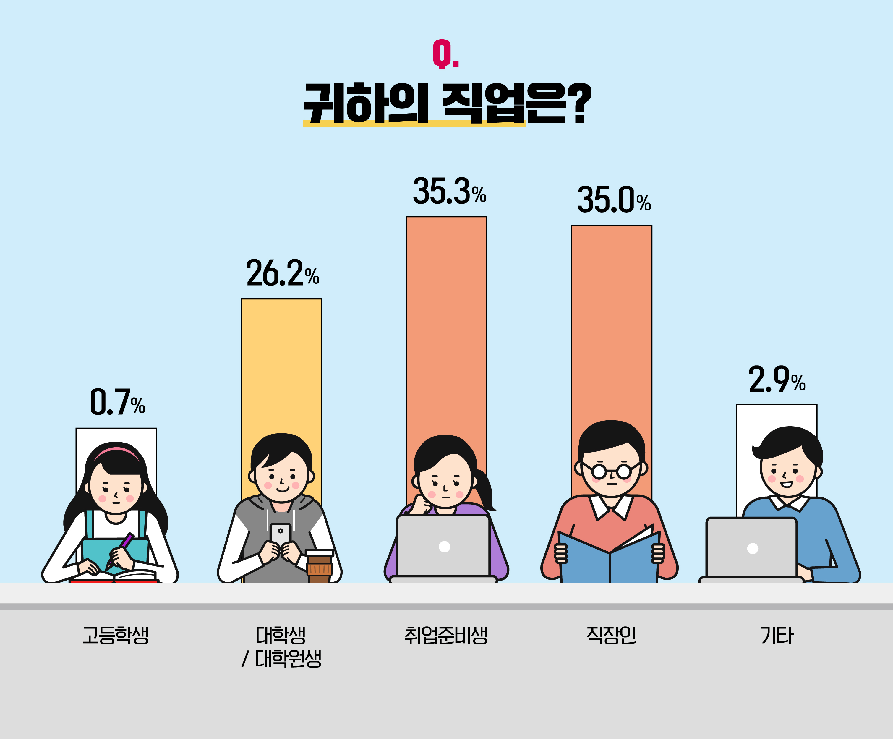 설문 응답자의 직업별 비중을 살펴보자면, 구직 활동과 직장 생활을 하고 있는 '취업준비생'과 '직장인'이 각 35.3%, 35.0%로 높은 참여율을 보였습니다. 뒤이어, '대학생/대학원생'이 26.2%를 차지하며 부캐에 대한 흥미를 드러냈습니다.
