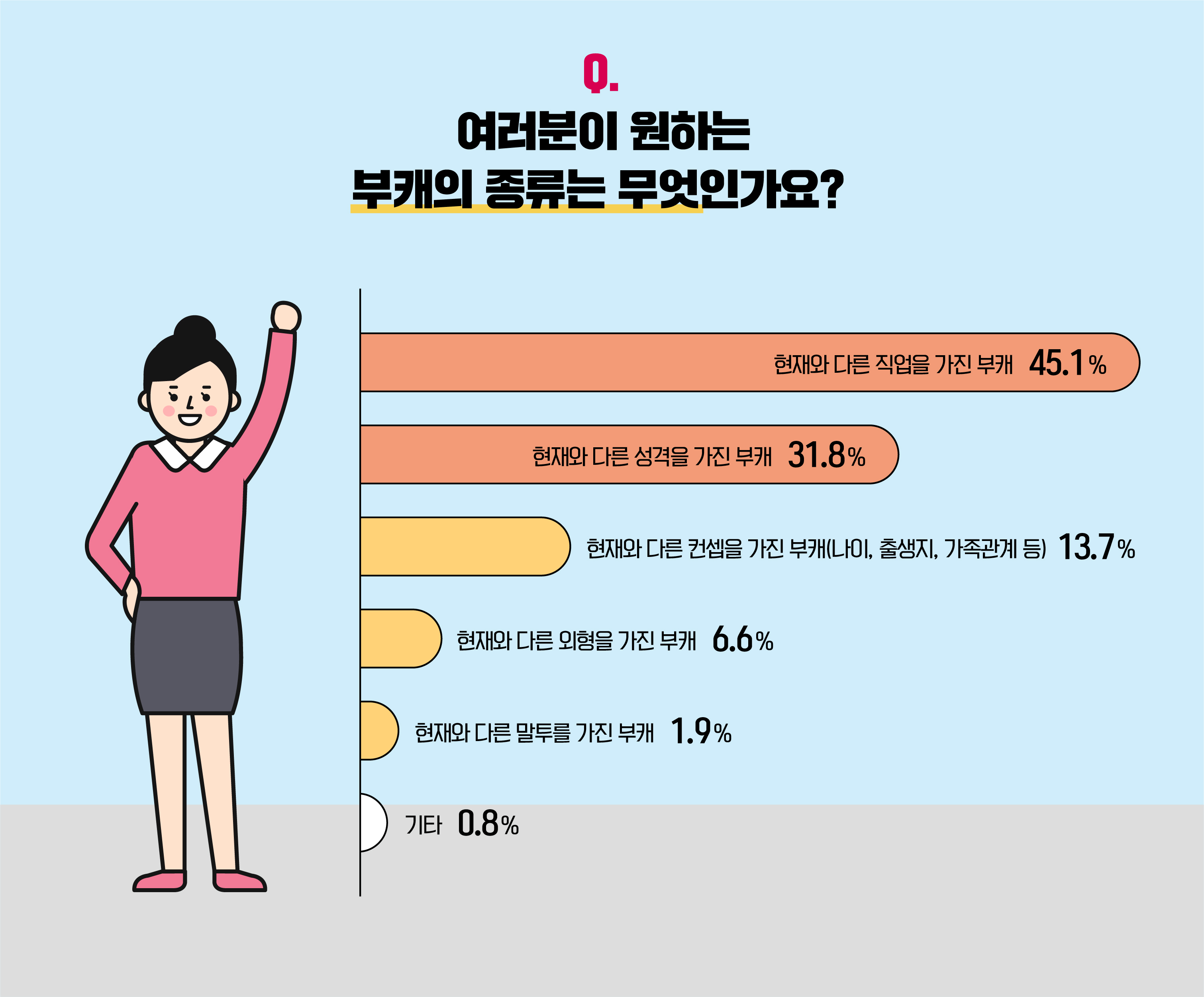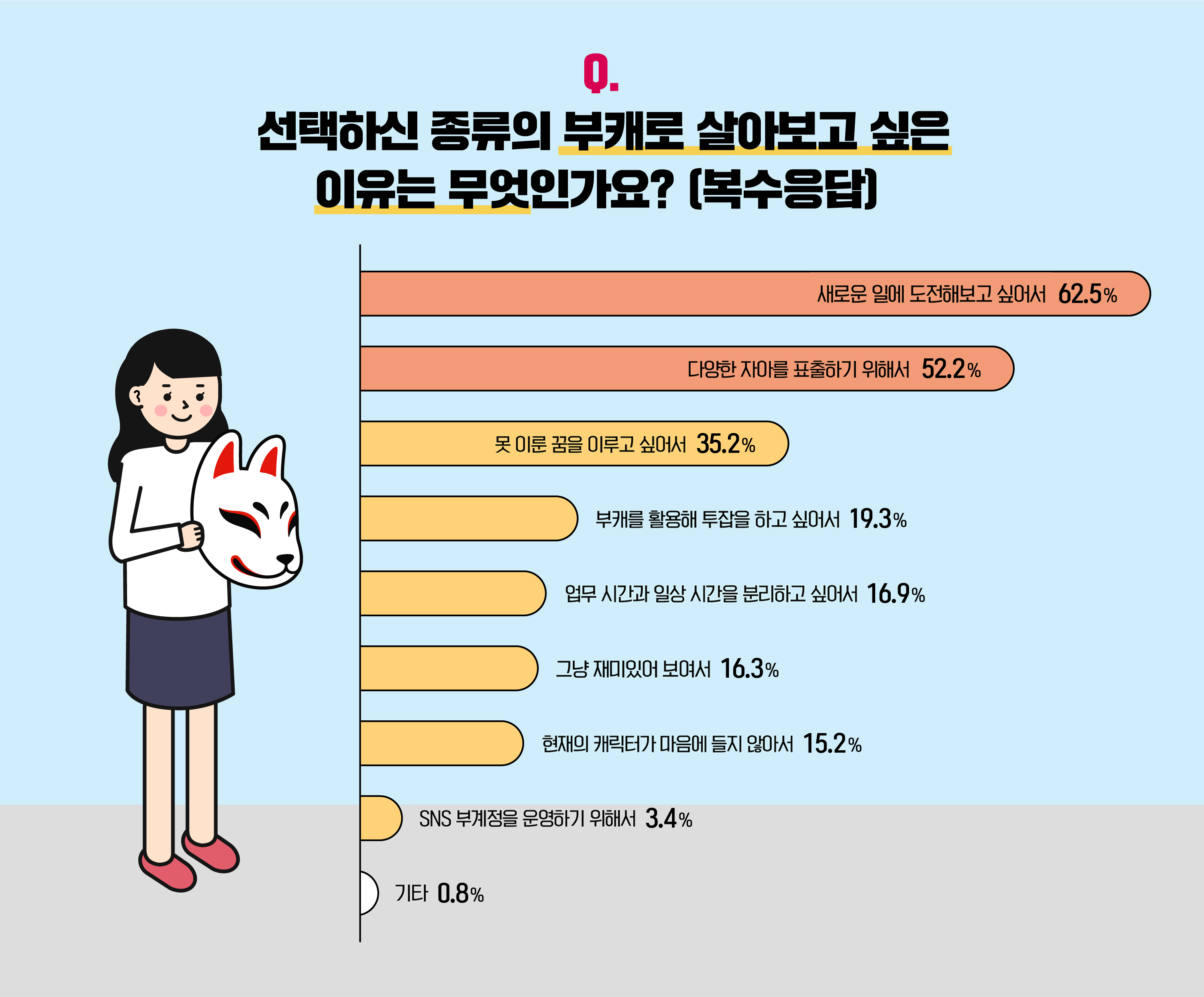 해당 부캐로 살아보고 싶은 이유에 관해서도 질문을 드려봤습니다. '새로운 일에 도전해보고 싶어서(62.5%)'와 '다양한 자아를 표출하기 위해서(52.2%)'라는 답변이 상위권을 기록한 가운데, '못 이룬 꿈을 이루고 싶어서(35.2%)'도 전체 인원 3분의 1 이상의 선택을 받았습니다. 더불어, '부캐를 활용한 투잡(19.3%)', '업무 시간과 일상의 분리(16.9%)'처럼 구체적인 조건을 포함한 대답과 '그냥 재미있어 보여서(16.3%)', '현재의 캐릭터가 마음에 들지 않아서(15.2%)' 같은 수동적인 관점의 의견이 흥미롭게도 비슷한 응답률을 나타냈습니다. 그 외 'SNS 부계정을 운영하기 위해서(3.4%)' 부캐로 살아보기를 희망한다는 답변 등 다채로운 시각을 확인할 수 있었답니다. :)