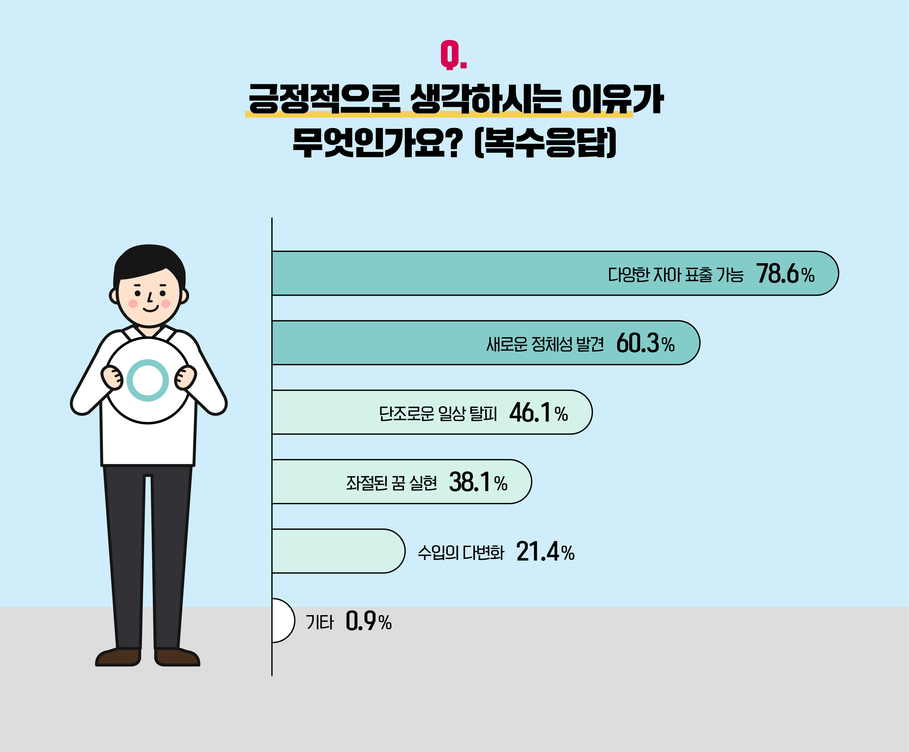 압도적인 결과에 대한 이유를 물어보지 않을 수 없죠. 부캐를 긍정적으로 바라보는 응답자 중 78.6%가 '다양한 자아 표출 가능'을 꼽았으며, 60.3%는 '새로운 정체성 발견'을 선택했습니다. 개인의 새로운 모습을 찾는 과정부터 표현하기까지, 부캐가 중요한 역할을 한다고 볼 수 있겠습니다. '단조로운 일상'에서 벗어나거나 '좌절된 꿈'을 실현할 수 있기 때문에 부캐 트렌드를 호의적으로 생각하는 사람이 46.1%, 38.1%로 뒤를 이었으며, 금전적 도움을 얻기 위한 '수입의 다변화'는 21.4%를 기록했습니다.