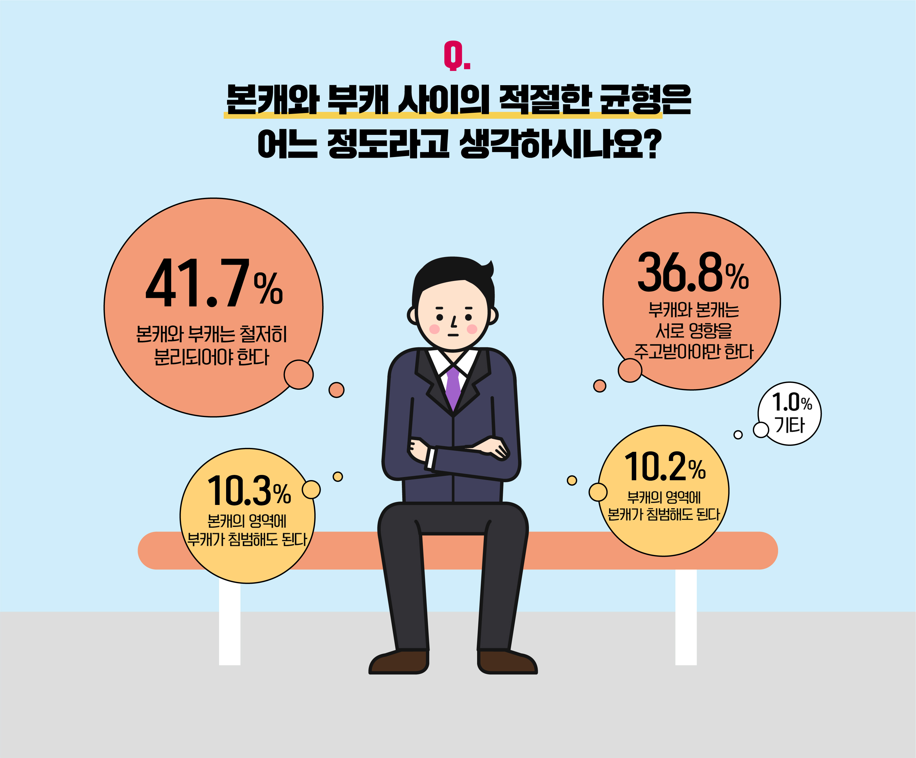 본캐와 부캐 간 알맞은 균형에 관한 데이터를 살펴보자면, 본캐와 부캐가 '철저히 분리되어야 한다'와 '서로 영향을 주고받아야만 한다'는 답변이 각각 41.7%, 36.8%를 기록했습니다. 상반된 내용이 나란히 위치한 점이 인상적이네요. 한편, 응답 인원의 10%가량은 본캐와 부캐가 상대방의 영역에 일방적으로 침범할 수 있다고 답했습니다.