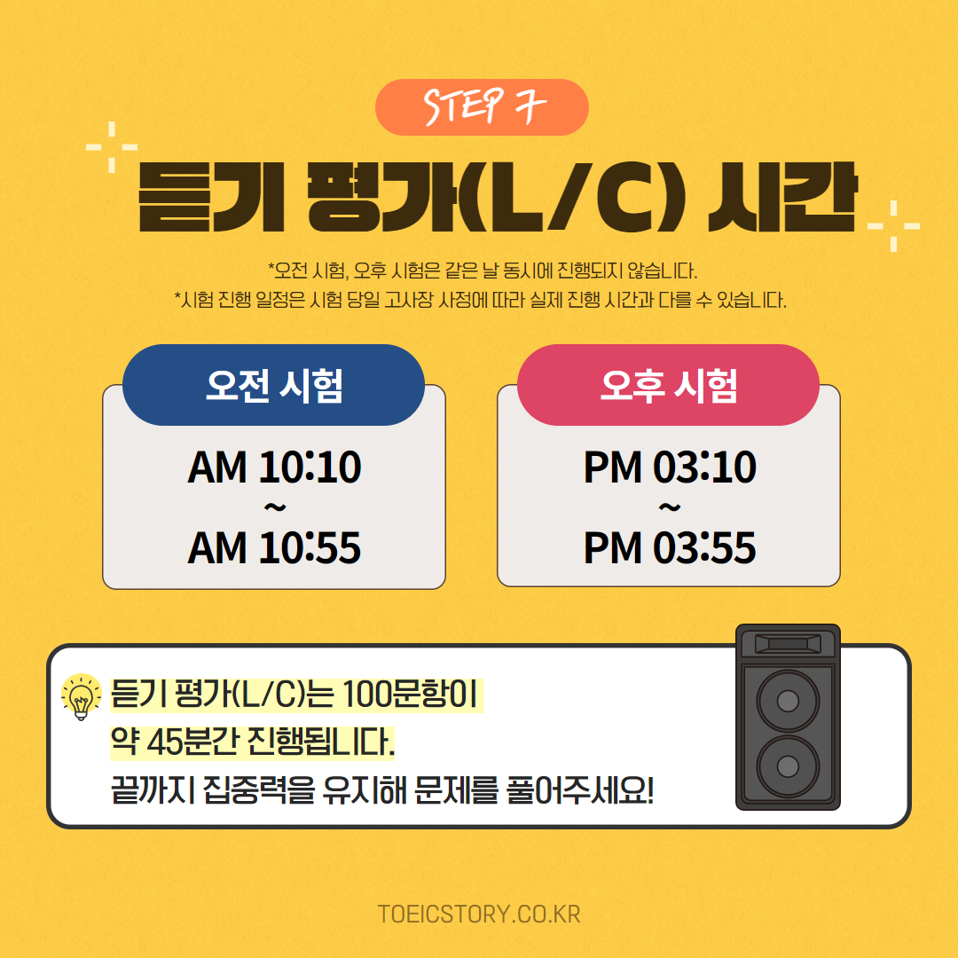듣기 평가(L/C)는 100문항이 약 45분간 진행됩니다. 끝까지 집중력을 유지해 문제를 풀어주세요!