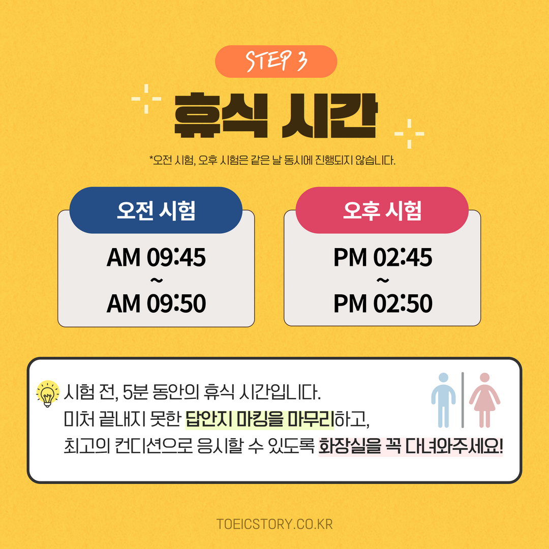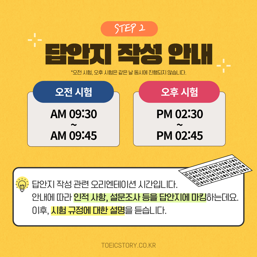 또한, 오전 시험과 오후 시험은 절대로 같은 날 동시에 진행되지 않습니다. 자세한 일정 및 시간은 토익 공식 홈페이지를 참고하시기 바랍니다.