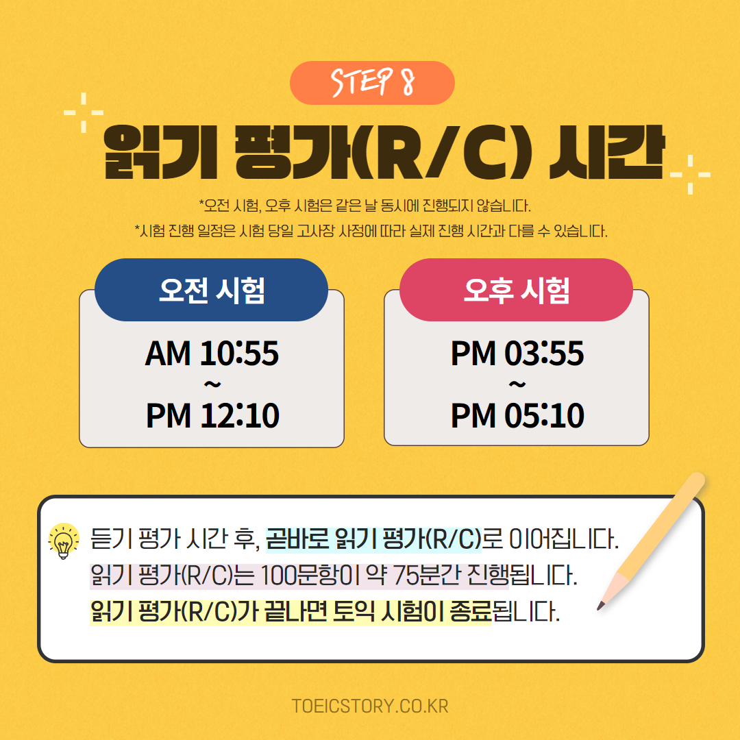 읽기 평가(R/C)는 100문항이 약 75분간 진행됩니다. 읽기 평가(R/C)가 끝나면 모든 시험이 종료됩니다. :)
