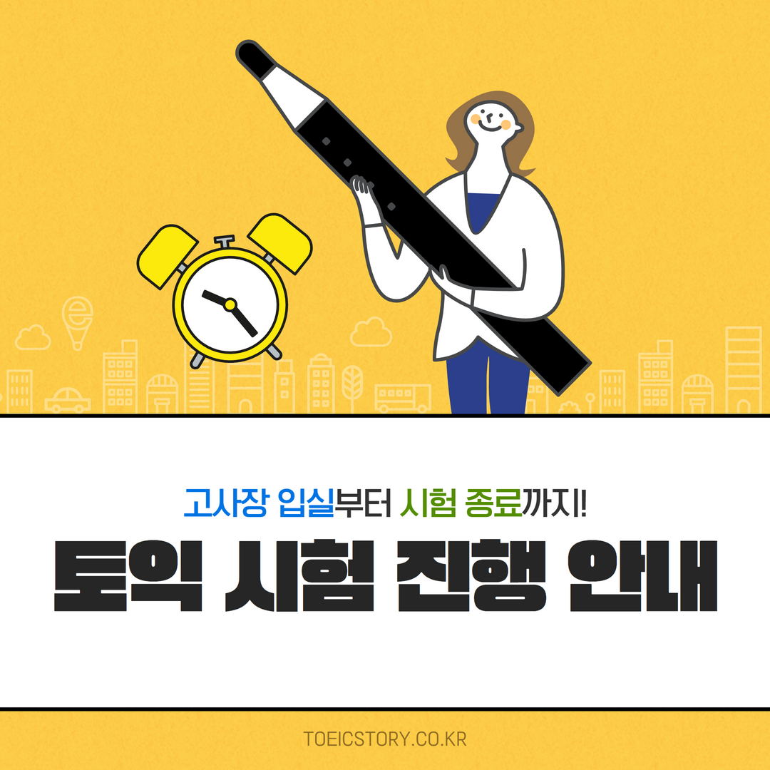 시험 당일 고사장에서 자신의 능력을 십분 발휘하려면 토익 진행 방식 및 시간에 대한 이해가 필수적인데요. 응시자 여러분이 계획적으로 시간을 분배해 효율적으로 시험을 치를 수 있도록 <토익스토리>에서 ‘토익 시험 진행'에 관한 정보를 정리해봤습니다. 함께 살펴보시죠 :)