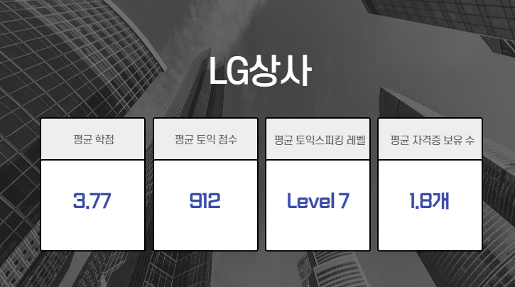 LG상사 합격자의 평균 토익스피킹 성적은 레벨 7입니다. 기아자동차, 현대모비스, 현대자동차 합격자의 성적은 레벨 6이고, LG상사 합격자의 평균 토익 성적이 가장 높았으며 평균 자격증 보유 수가 가장 많은 기업은 현대자동차입니다.