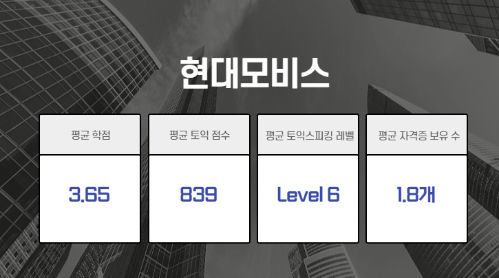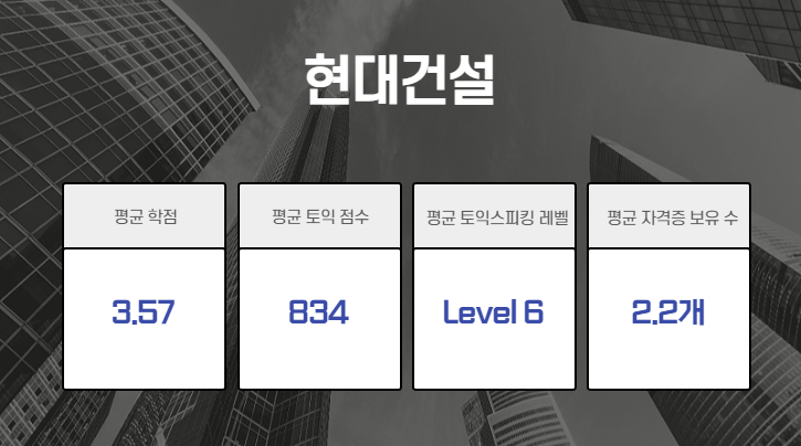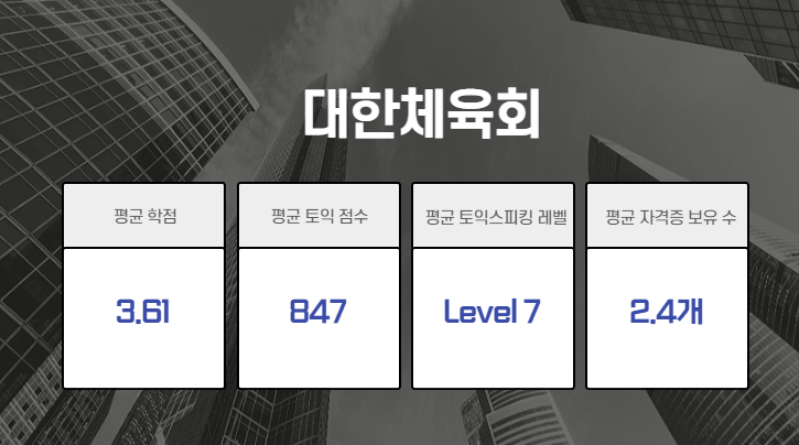 현대건설과 한국가스기술공사 합격자의 평균 토익스피킹 성적을 6레벨로 동일했습니다. 대한체육회의 성적은 레벨 7로 현대건설과 한국가스기술공사보다 조금 높았는데요. 평균 학점 역시 대한체육회 합격자들의 점수가 3.61로 가장 높았습니다.
