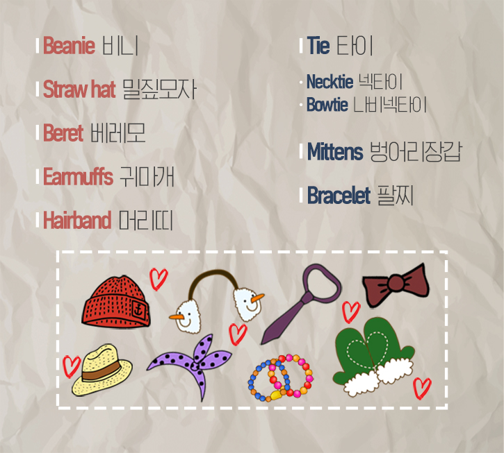 셔츠 위 목에 두르는 패션 아이템을 칭하는 단어는 'Tie'입니다. 그 중에서도 가장 보편적인 넥타이는 'Necktie'이고 귀여움을 가미한 나비넥타이는 'Bowtie'로 나타냅니다. 이어서 귀여운 느낌을 가장 강력하게 전달하는 아이템 중 하나인 벙어리장갑은 'Mittens'입니다. 복싱, 야구 등 스포츠에서 사용하는 글러브는 'Mitt'라는 점도 참고해 주세요. 마지막으로 밋밋한 손목에 포인트를 주는 팔찌는 'Bracelet'이라고 쓴답니다!