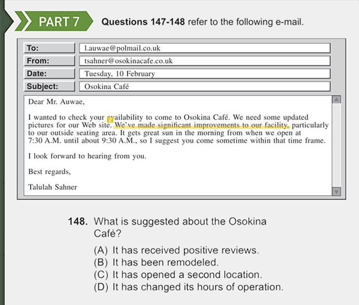 Q148의 단서는 'We’ve made significant improvements to our facility (우리는 우리의 시설을 크게 개선했습니다)'일세. 잠시 지문에서 벗어나 현실 세계로 시야를 넓혀보기로 하지. 우리가 SNS를 업데이트하는 가장 큰 동기 중 하나는 새로운 무언가를 했을 때라네. 신상 신발을 사거나, 낯선 음식을 먹는 모습을 SNS에서 자주 본 기억, 다들 있지 않은가? 하물며 항상 고객의 관심을 끌어내야 하는 사업자 입장에선 얼마나 새 소식을 알리고 싶겠나. 다시 말해, '카페 시설 개선'이라는 정보를 두고 '새로운 모습에 대한 선호도'를 근거로 하여 사진 촬영의 이유를 추론할 수 있다는 것일세.