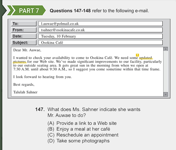 Questions 147-148 지문은 Talulah Sahner가 Mr. Auwae에게 발송한 이메일 형식의 글이라네. 메일 형태의 글은 발신자, 수신자, 날짜, 제목을 먼저 확인해야 한다고 말했었지? 유심히 보다 보면 발신자의 메일 주소와 제목에 'Osokina Café'가 모두 들어가 있다는 걸 확인할 수 있다네. 토익 기출 지문이 대부분 비즈니스 상황을 기반으로 한다는 점에서, 본 글은 카페 관계자가 업무 관련 의견을 전달하는 내용일 가능성이 높겠지. 상황적인 맥락을 머릿속에 넣어둔 채 문제로 넘어가 보세!