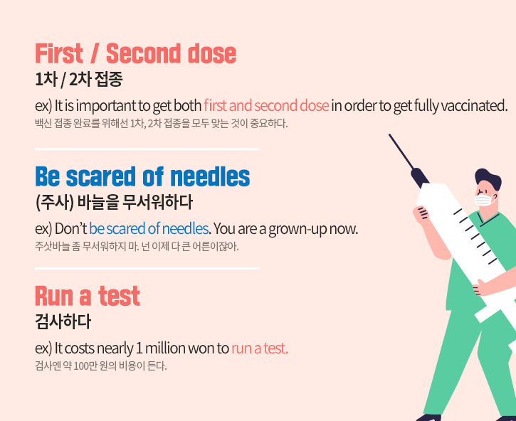 백신 예약, 접종, 증상 관리까지 총 세 단계에 걸쳐 영어 표현을 배워봤습니다. 국내에서 백신을 접종할 경우 당장 사용 빈도가 높진 않을 수 있는데요. 하지만 앞으로 영자 신문, 논문 등 다양한 글에서 지속적으로 회자될 주제이기에, 오늘 소개해드린 내용을 확실히 알아두시길 바라겠습니다.