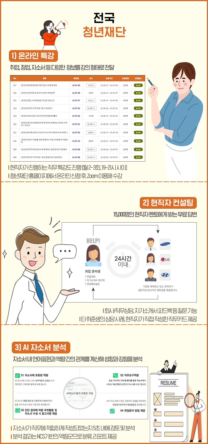 첫번째는 온라인 특강으로 사회 여러 분야의 전문가가 진행하는 강의를 통해 NCS, 채용동향, 취업, 창업, 자소서 등 다양한 정보를 제공합니다. 강사 중에는 실제 현직자도 있어서 매월 2-3회 직무 특강이 열리는데요. 취준생에게 도움이 되고자 퇴근 후 시간대인 19-21시에 직접 강의를 하는 열정을 보여주고 있다고 합니다. 청년재단 홈페이지(https://yhf.kr)에서 참여 신청이 가능하며, 강의 수강은 Zoom 애플리케이션으로 이뤄진다는 점을 참고해 주세요.