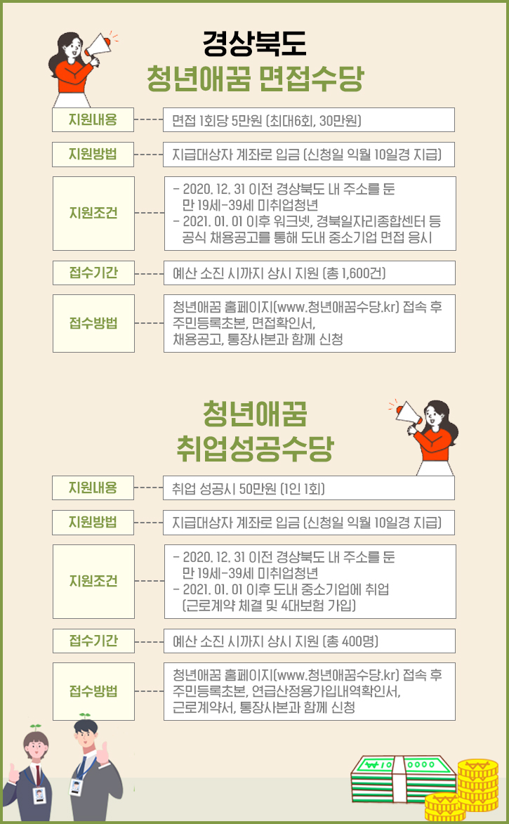 더불어 경상북도 내 중소기업에 첫 취업을 성공한 분들에게는 청년애꿈 취업성공수당 50만원이 지급되는데요. 면접수당과 지원조건은 비슷하지만, 근로계약 체결 및 4대보험에 가입해야 취업으로 인정된다는 점을 유의해 주세요. 예산 규모론 총 400명에 해당되는 금액이 책정됐답니다. 마찬가지로 청년애꿈 수당 홈페이지에서 주민등록초본, 근로계약서, 통장사본 등과 함께 접수 가능하니 지원금 수령 기회를 놓치지 말아 주세요!