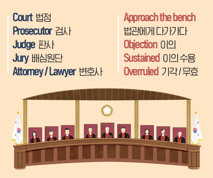 법률적 해석을 도와 개인의 권리 보호를 돕는 변호사는 'Attorney'와 'Lawyer'이며, 특히 Attorney는 미국에서 많이 사용하는 단어입니다. 변호사는 법정이 진행되는 동안 증거 제출 및 확인, 주의 전달 등의 이유로 법관에게 다가가야 하는 경우가 있습니다. 이를 'Approach the bench'라고 하는데요. 공원에 놓인 의자로 잘 알고 있는 Bench가 '판사'라는 의미도 지니고 있기에 활용되는 표현입니다.