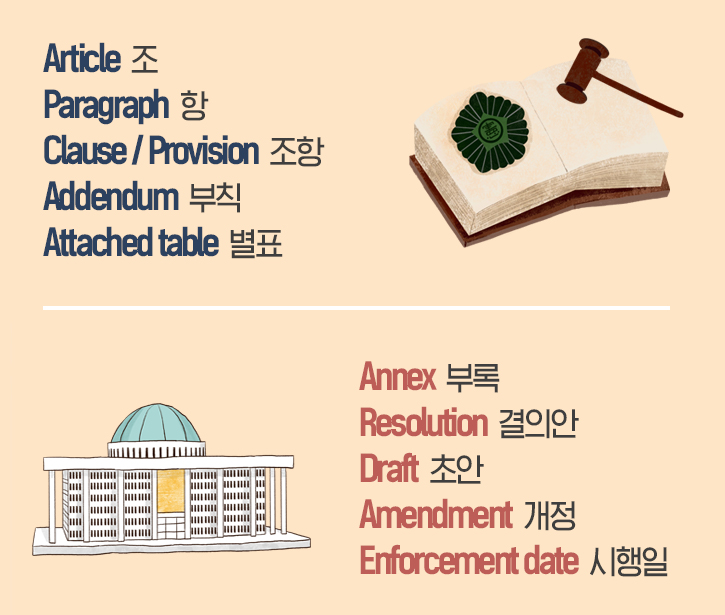 법체계가 복잡한 만큼 법안의 종류도 다양합니다. 'Resolution'은 의결에 부칠 의안인 ‘결의안’을 말하며 입법 과정에서 처음으로 작성된 법안인 '초안'은 'Draft'입니다. 만약 제시한 법안이 채택되지 못하거나 기존 법안에 문제가 있다면 'Amendment(개정)'이 필요하겠죠? 나아가 최종 법안이 효력을 발생하는 일자인 '시행일'은 'Enforcement date'라고 한답니다!