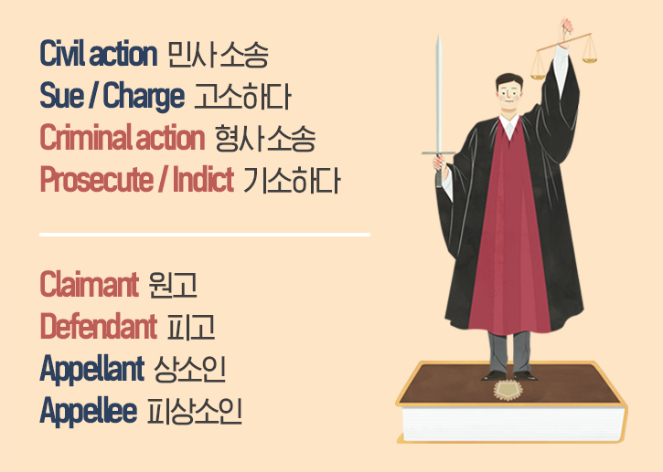 법정에서 소를 제기한 사람을 '원고(Claimant)', 소송을 당한 자를 '피고(Defendant)'라고 합니다. 주장한다는 의미의 'Claim'과 방어한다는 뜻의 'Defend'에서 유래한 단어들이네요. 아울러 재판 결과에 대해서 상급 법원에 취소 및 변경을 요청하는 상소 제도가 있습니다. 원고, 피고를 막론하고 상소를 제기하는 상소인은 'Appellant', 상소를 당한 자인 피상소인은 'Appellee'인데요. 멘토(Mentor)와 멘티(Mentee)처럼 단어의 어미에 따라 상대적인 위치를 나타낸다는 점, 알아두시길 바랍니다!