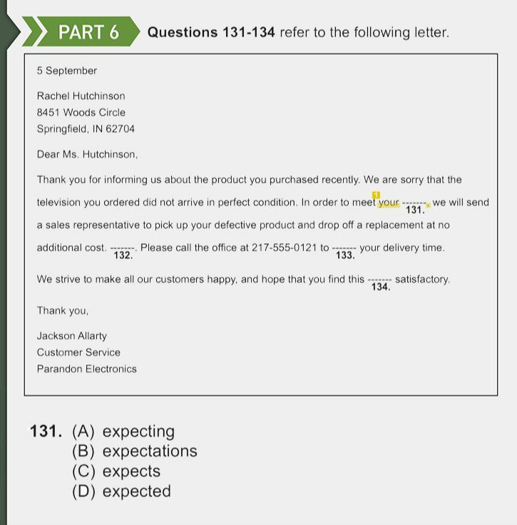 Questions 131-134 지문은 Jackson Allarty가 Ms. Hutchinson에게 보내는 메일이라네. 글 하단의 'Customer Service'로 미루어 보아, 고객 서비스 담당자가 제품을 구매한 소비자에게 전달하는 내용이겠구먼. 본 상황을 염두에 두고 본격적인 단서 추리로 들어가 보세.