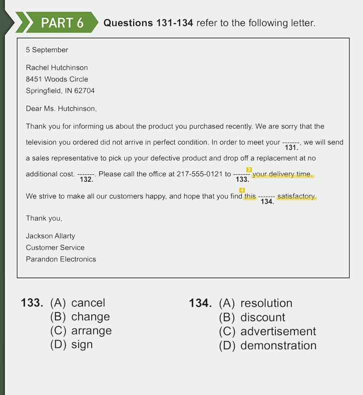 '---134---에 만족하길 바란다'라는 글 마지막 문장의 핵심은 앞서 전달한 내용을 고객이 잘 받아들이길 바라며 메일을 마무리 짓겠다는 의미일 것일세. 다시 한번, 지문은 소비자의 불편에 대한 해결책 제공을 안내하는 글이라는 점을 생각해 본다면 정답은 (A) Resolution(해결책)일 수밖에 없지. 참고로, ‘Find + 명사 + 형용사’는 ‘명사’가 ‘형용사’하다고 느끼다(발견하다)라는 의미를 갖는다네. 종종 출제되는 표현이니 챙겨주게나 :)