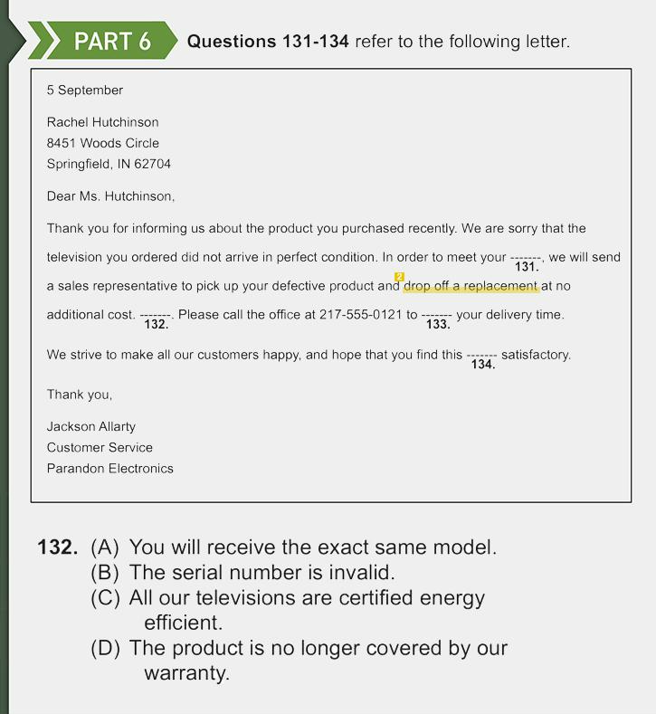 다시 단서로 돌아와보도록 하지. '교체품을 가져다주겠다'라는 말은 똑같은 상품으로 바꿔준다는 말과 같으므로 (B) You will receive the exact same model(당신은 정확히 같은 상품을 수령할 것입니다)가 정답이라네. 어때, 생각보다 간단하게 답이 보이지?