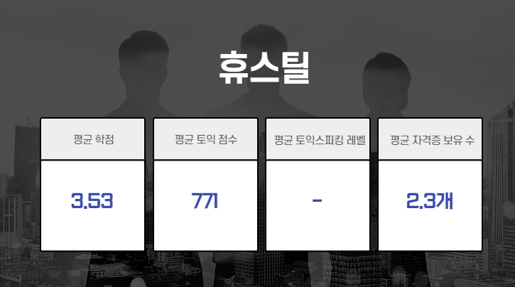 휴스틸 신입사원의 평균 학점은 3.53점이며 토익 점수는 771점, 평균 자격증 보유 수는 2.3개입니다.