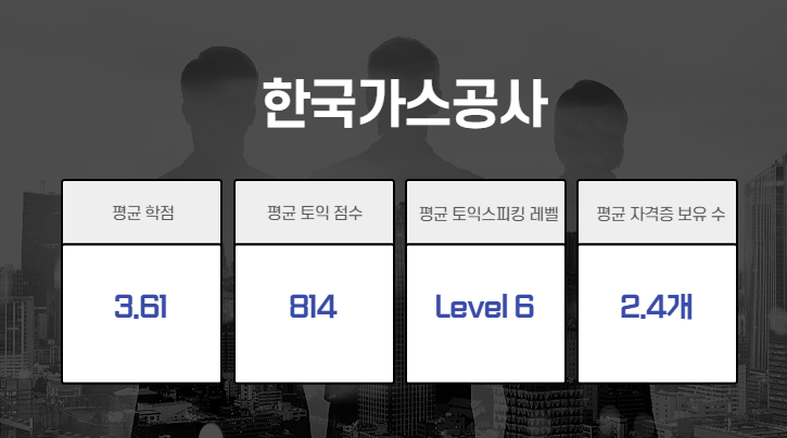 한국가스공사 신입사원의 평균 학점은 3.61점 토익 점수와 토익스피킹 레벨은 각각 814점, 6레벨이며 평균 자격증 보유 수는 2.4개입니다.