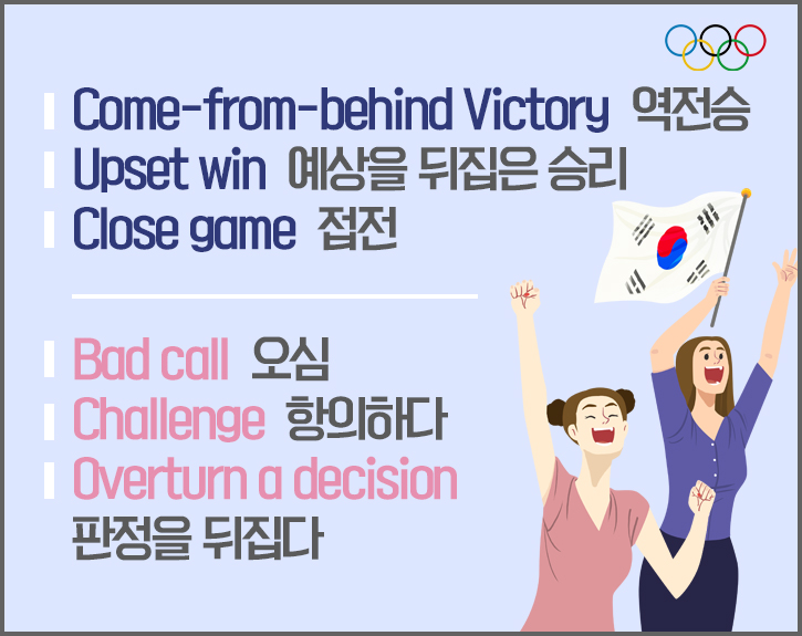 반면 모든 경기가 해피엔딩으로 끝나진 않습니다. 특히 선수는 최선을 다했는데 결정적인 순간 심판의 ‘오심(Bad call)’으로 석연찮은 결과를 받아들여야 한다면 분노가 머리끝까지 차오르게 되죠. 다행히 최근엔 VAR 등 ‘항의(Challenge)’를 어느 정도 보장하는 규칙이 종목마다 많이 마련되었습니다. 그 덕에 억울한 판정을 뒤집어낸(Overturn a decision) 사례도 늘었답니다. 스포츠의 핵심은 승리가 아니라 공정하고 정정당당한 승부라는 점이 더 잘 보이는 올림픽을 기대해봅니다 :)