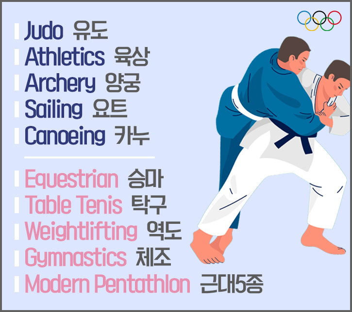 사실 대부분의 올림픽 종목은 평소에 접하기 어려운 경우가 많습니다. 축구, 야구 등 몇몇 인기 상업 스포츠를 제외하곤 TV 중계조차 제대로 이뤄지지 않기 때문이죠. 결국 4년에 한 번 해당 종목들을 보게 되니 한국어로도 이름이 헷갈리곤 합니다. 영어로는 더 낯설게 느껴지고요 :(