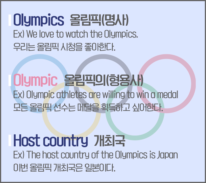 ‘아니, 시작부터 이게 무슨 소리야’라며 당황하신 분들, 분명 있으리라 생각됩니다. 국내에서 ‘올림픽’이라는 단어를 사용하면서 생긴 혼동일 텐데요. 영어에선 ‘Olympics’라고 ‘-s’가 붙어야 ‘올림픽’이라는 뜻을 지닌 명사이며, 주로 정관사 ‘The’와 함께 쓰인답니다. 그럼 ‘Olympic’은 어떻게 활용되는 걸까요? ‘Olympic’은 ‘올림픽(의) 선수’, ‘올림픽(의) 경기’ 등 형용사로서 뒤에 오는 단어를 수식해 주는 역할을 합니다.