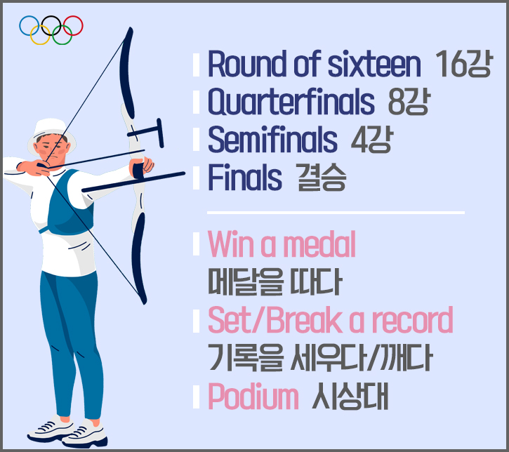 피나는 노력과 노련한 경기 운영 끝에 메달을 딸 때는 ‘Win a medal’이라고 합니다. 보통 ‘Win’이 이긴다는 뜻의 자동사로 쓰이지만 본 표현처럼 타동사 역할도 한다는 사실, 유의 바랍니다. 또한 올림픽에선 나라별 신기록, 세계 신기록, 올림픽 신기록 등 다양한 기록이 만들어지는데요. 기록을 세울 시엔 'Set a record', 기록을 갈아치울 시엔 ‘Break a record’가 사용됩니다. 자랑스러운 태극 전사들의 기록 경신 여부도 챙겨본다면 올림픽 시청에 또 다른 재미 요소가 추가되지 않을까 싶네요 :) 마지막으로 최종 순위 1, 2, 3등이 목에 메달을 걸 수 있는 시상대는 ‘Podium’입니다. 남은 경기에서도 우리 선수들이 시상대 가장 높은 곳에서 애국가를 들려줄 수 있도록 많은 응원 부탁 드립니다!